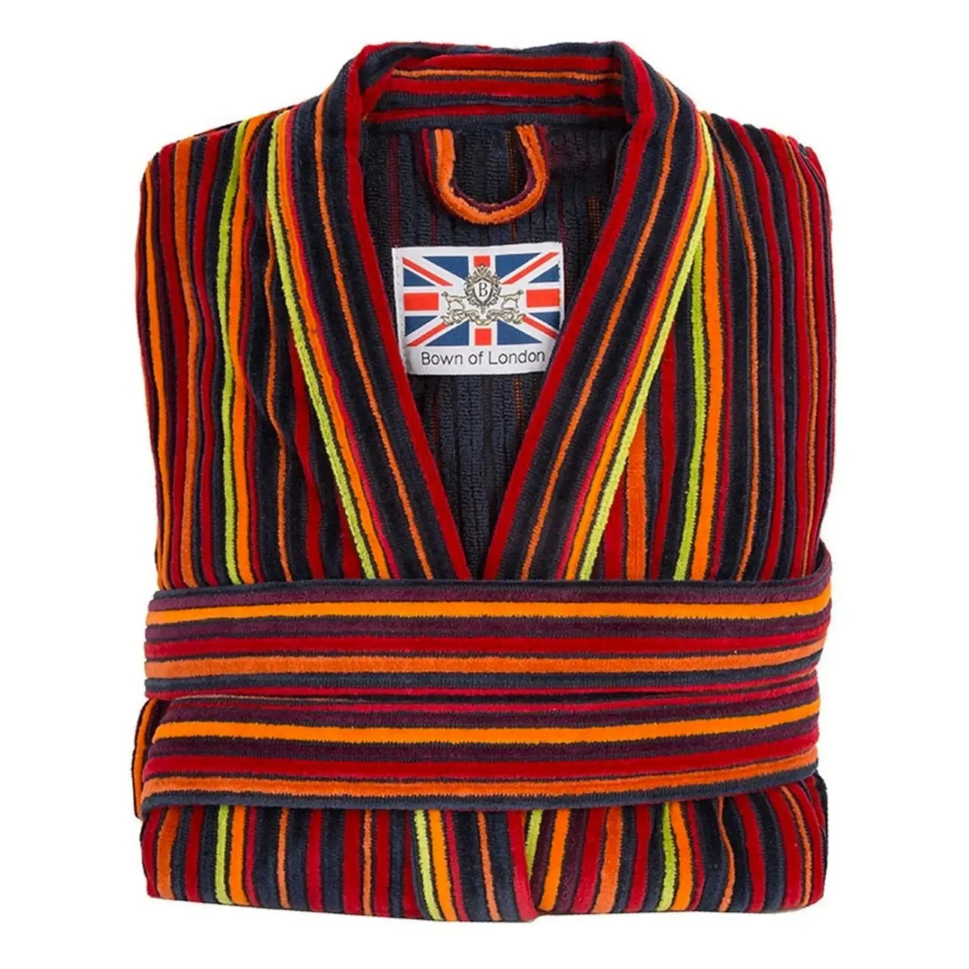 Bown of London Regent Men's Dressing Gown in Red / Multi. The Regent designer dressing gown for men remains a best seller - bold, harmonious multicoloured stripes set against a lustrous navy velour backdrop. This quality bathrobe features our signature half shawl collar for optimum warmth and comfort and comes with a matching tie belt. There are two waist loop heights so that you can tailor your gown to the perfect fit and the foldback cuffs also allow you to fit your desired sleeve length.